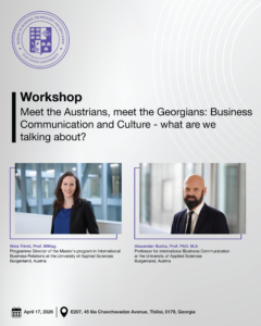 ვაკანსიები by webmaster on 25.03.2019 - 19:13PM Meet the Austrians, meet the Georgians: Business, Communication and Culture – what are we talking about? An interactive WorkshopPublic Lecture: Urban transformation and the importance of sustainable and social public spacesPublic Discussion: Sustainable Design in the Era of Climate Crisis – The Georgian ExperienceMy Socialist Home” – Film screening and discussionDesign Workshop in Agrigento Agrigento Capital of Culture. Memory The Enchanted CityAWS Community Day Georgia 2025Public Online Lecture by Professor Andreas Lechner “Typologies of Transformation“Iliauni Technology Forum 2025Third Call for Applications for Student Communication Volunteers at the School of TechnologyMemorandum of Cooperation with the Georgian Artificial Intelligence Association Share on : Research contact
